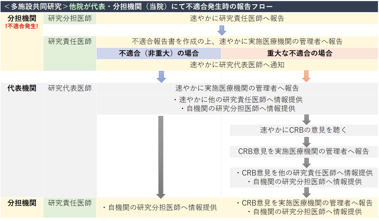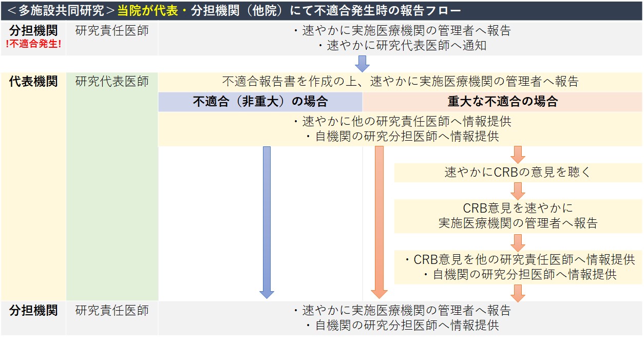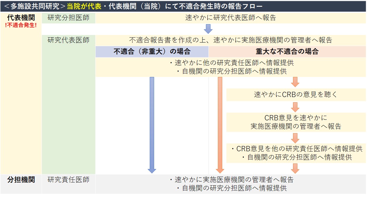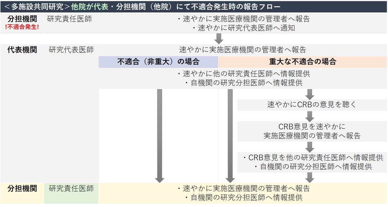 臨床研究法では、臨床研究が省令または研究計画書に適合していない状態(不適合)であると知ったとき、研究責任(代表)医師は、以下の対応をしなければならないとされています。