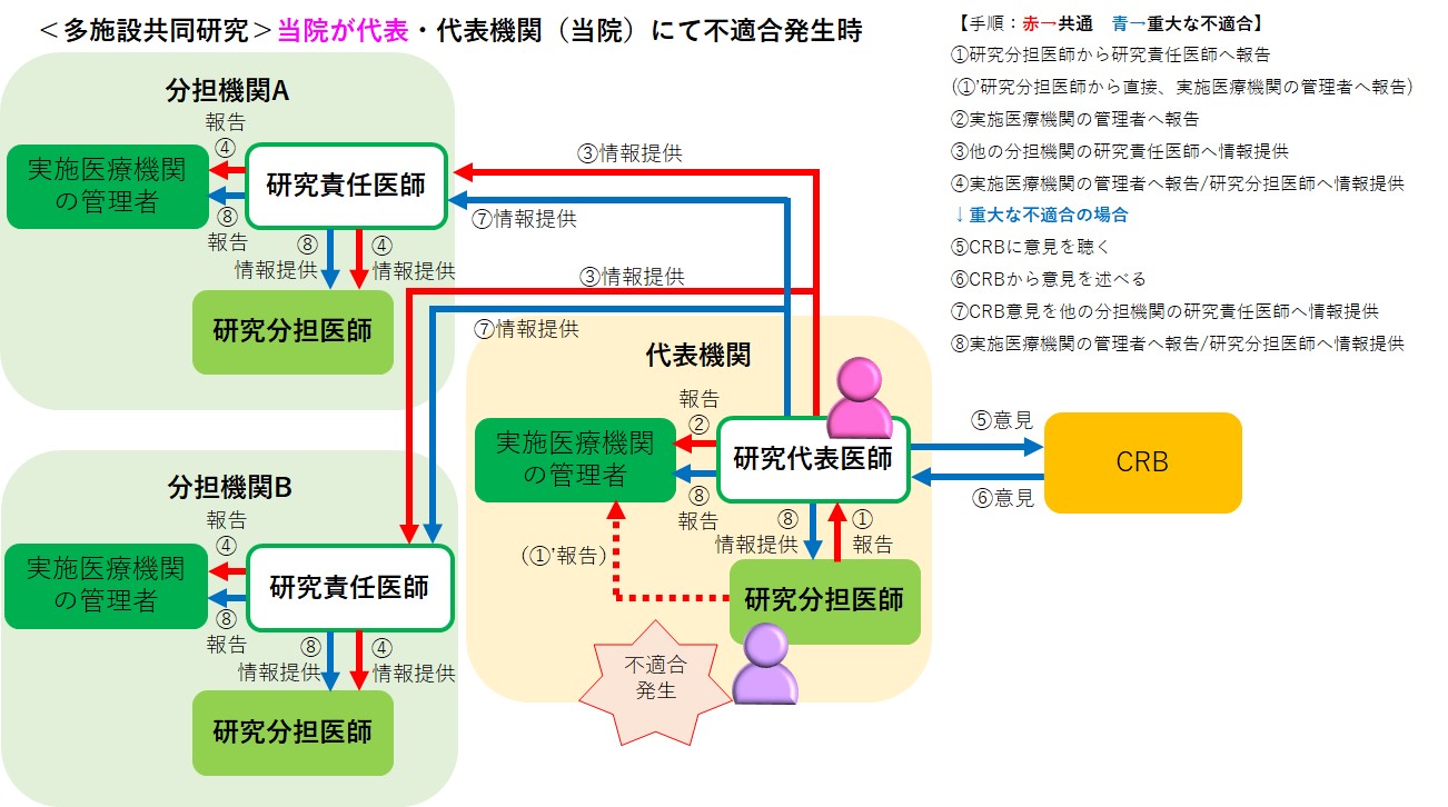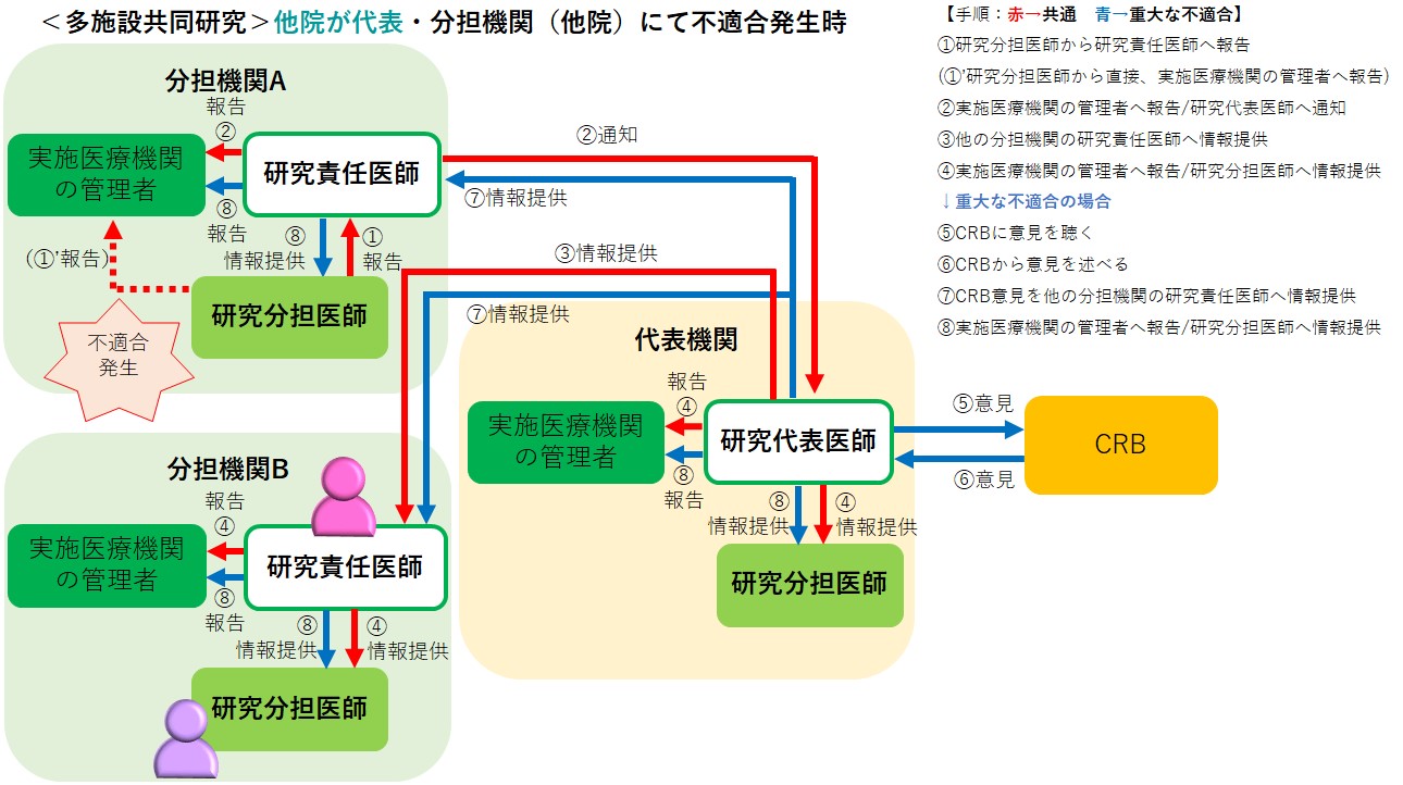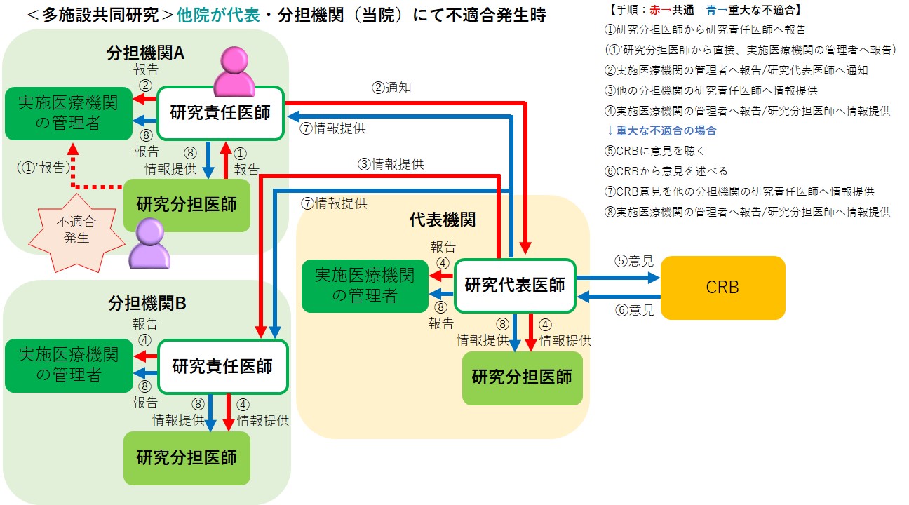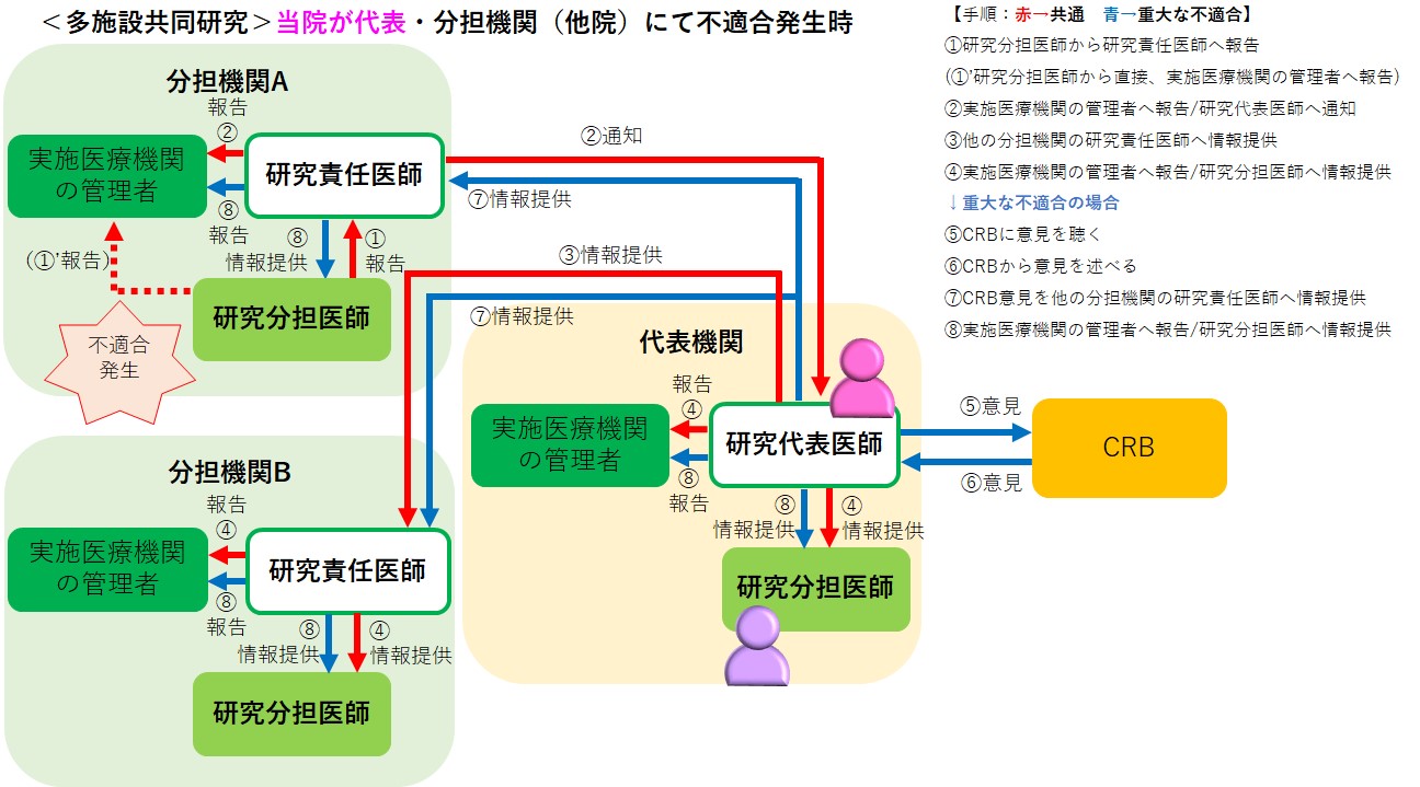 以下のフローに準じて、ご報告ください。研究の実施体制及び発生施設別の例:①~④も適宜ご参照ください。